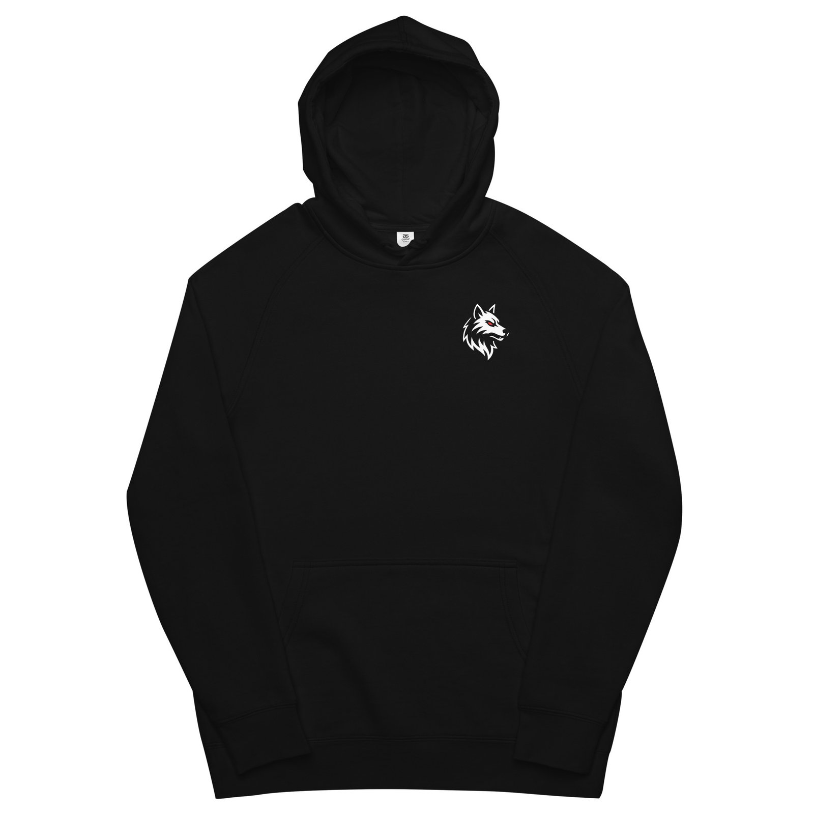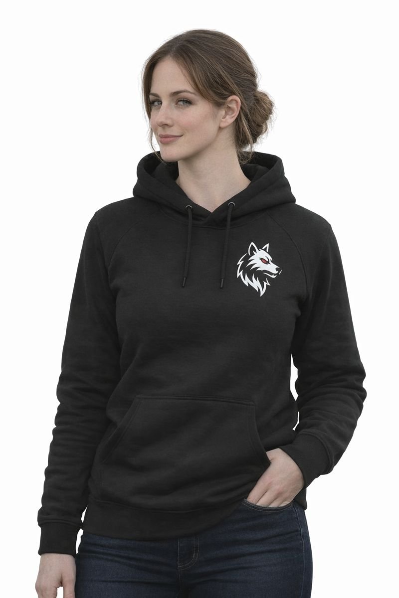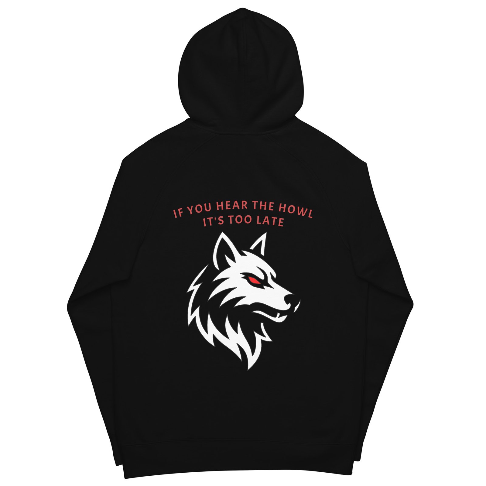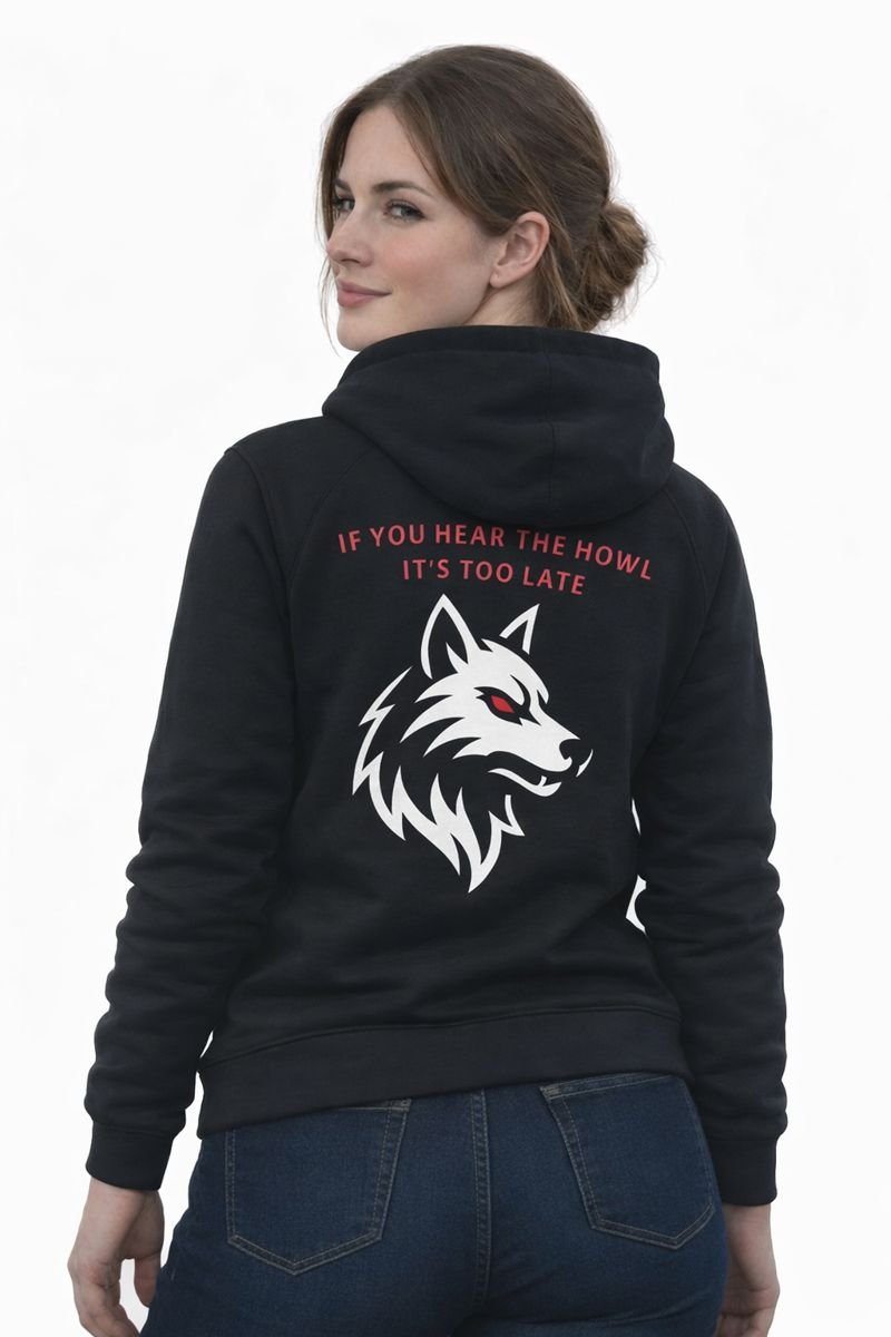 This black hoodie keeps it simple from the front with a small Wolf Mark on the breast and sends a clear message from the back. The bold wolf head graphic with the red eye is paired with the line “If you hear the howl, it’s too late”, sitting high between the shoulders where it belongs. No noise, no clutter, just intent.