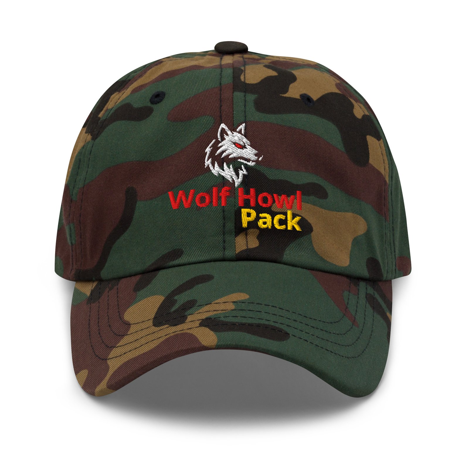 Clean black cap, sharp embroidered wolf, and Wolf Howl Pack stitched front and centre. No noise. No flex for outsiders. Just a clear signal that you are part of something. 100% chino cotton twill. Green Camo color is 35% chino cotton twill, 65% polyester. Rugged cotton feels solid on your head all day and the adjustable strap means it fits just right whether you’re on the range, walking the streets, or dropping in to a war zone.